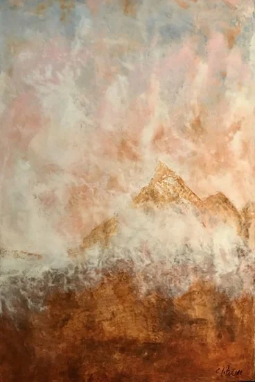 This is one of my favorites. Cold wax and oil is unique to work with and dries beautifully. One of the oldest methods of painting, the pieces from history are wonderfully preserved because of the denseness of the wax. The subtlety of color like the mist of a fog shades the sky and mountains.